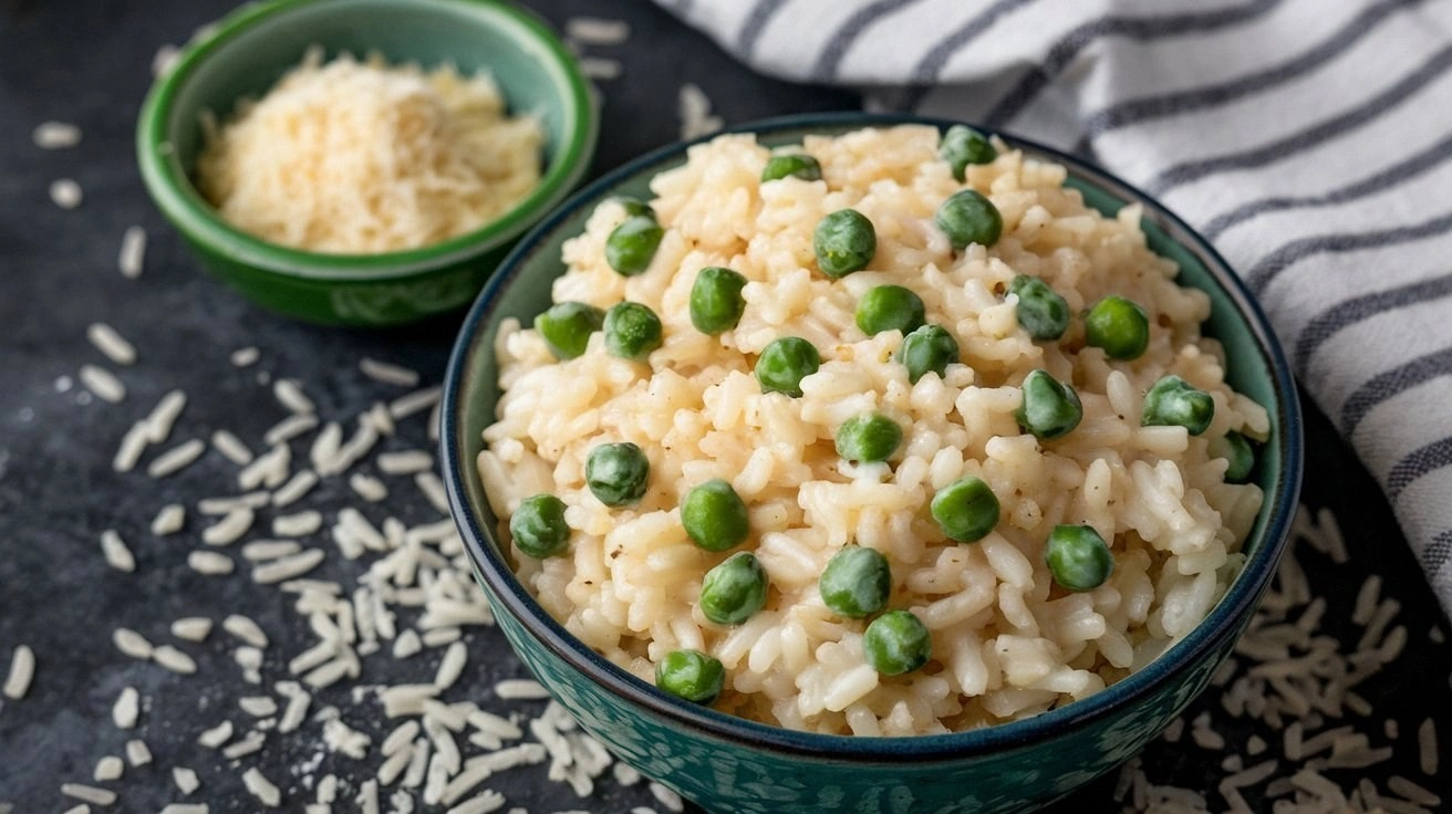 Arborio rice, the star of the show, is a short‑grain rice that releases starch during cooking, giving the dish a silky, almost creamy consistency. Peas, whether fresh or frozen, contribute a sweet burst of color and a pleasant bite. Butter adds a subtle richness that coats the grains, while olive oil provides a clean, fruity background. If you prefer a vegan version, simply replace the butter with a drizzle of extra‑virgin olive oil.